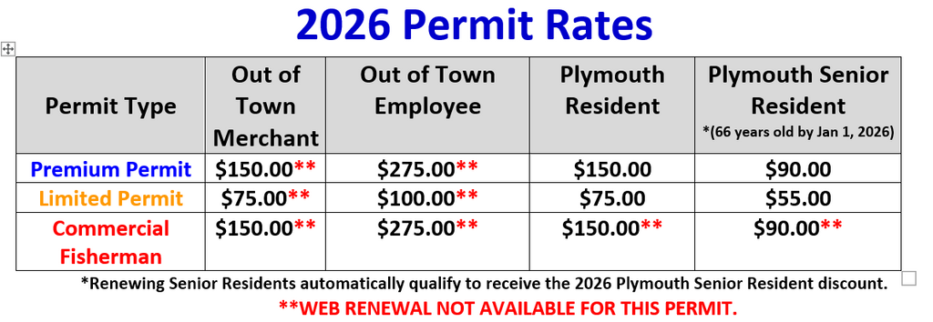 All applicants who apply in-person or by mail must provide a current Commercial Fisherman license with a Plymouth homeport, a valid driver’s license, and a current vehicle registration. Park Plymouth caps the number of Commercial Fisherman permits issued each year to 75 and they are sold on a first come, first serve basis.
